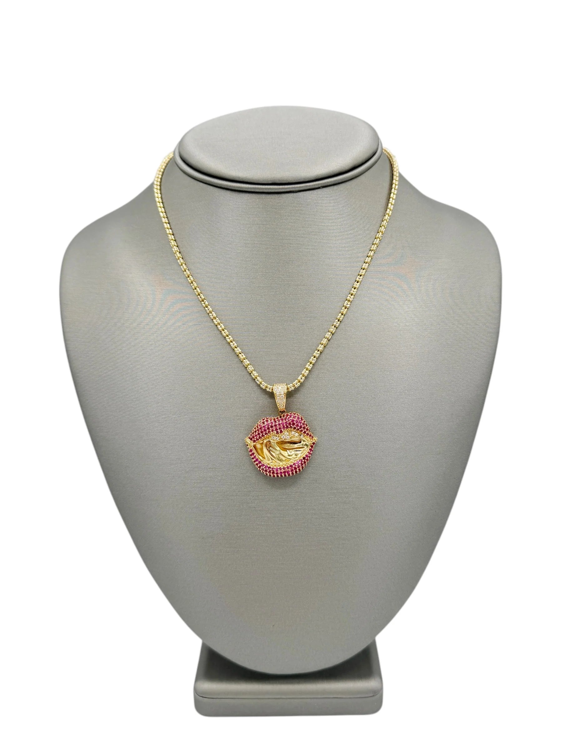 New 14K CZ Lips Pendant & Ice Chain Made of Real 14K Yellow Gold, 100% Guaranteed Gold. Buy with Confidence